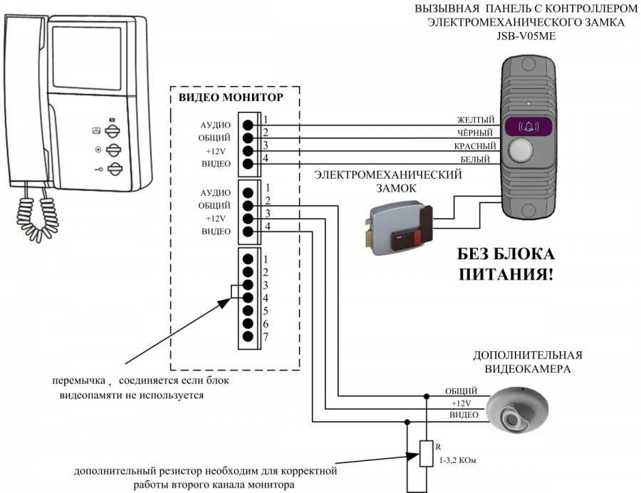 Второй вариант — присоединение панели вызова к блоку питания, монитору и электронному замку.
