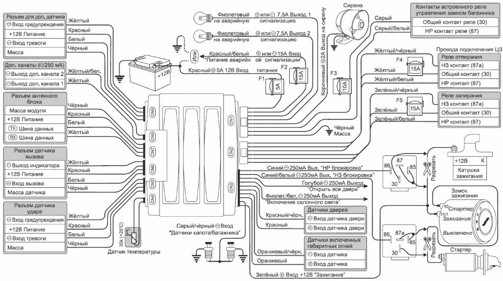 Схемы подключения сигнализации можно найти в инструкции по установке. Подключение проводов 6-контактного разъема питания CN1: