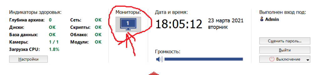 Камера добавлена. Для просмотра камеры на сервере, т.е. на ноутбуке или ПК. Нужно нажать на значок монитора. Тащим вниз красный треугольник и жмем на монитор.
