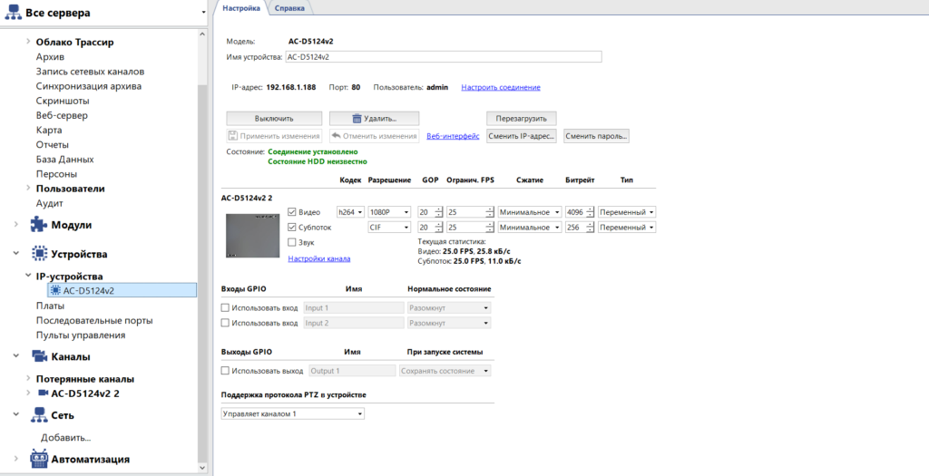 Для контроля и позиционирования используется программный модуль или специальный пульт управления PTZ для скоростного перемещения камеры. Устройство должно поддерживать соответствующие протоколы контроля и быть совместимым с Trassir.