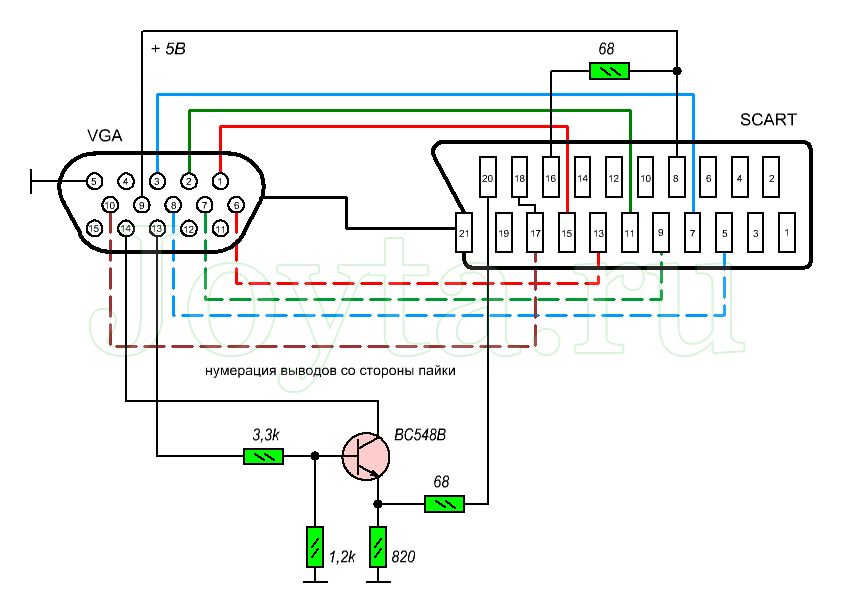 В основном используются три линии RGB (VGA контакты 1, 2, 3) подключаемые к соответствующим контактам SCART (контакты 15, 11, 7). Так же необходимо соединить и общие провода каждого канала (конечно достаточно одного общего провода, но для качественного экранирования лучше использовать их все). Для этого выводы с VGA (6,7,8) необходимо соединить с 13, 9, 5 SCART.