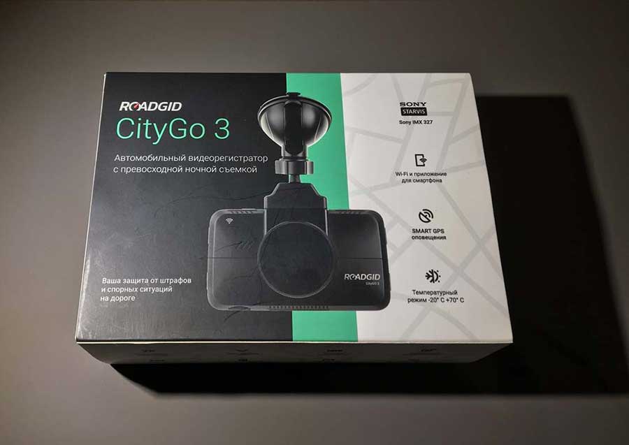 Модель Roadgid CityGo 3 продается в вместительной коробке, изготовленной из плотного картона. На верхней части размещена фотография гаджета с кратким описанием его характеристик.
